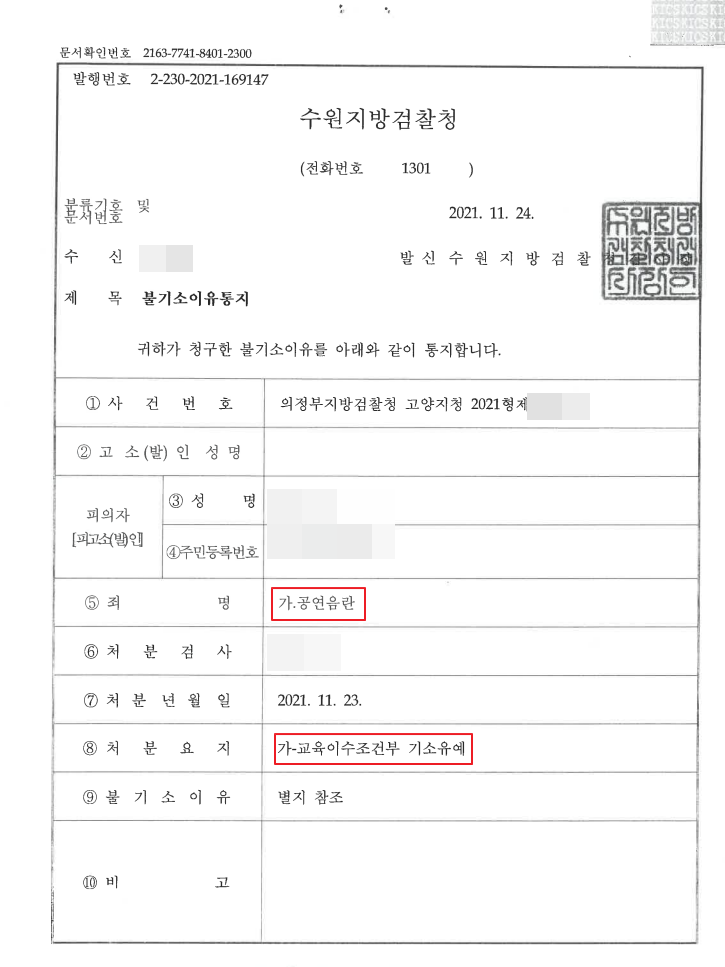 교육조건부 기소유예 처분을 받게 되었습니다.