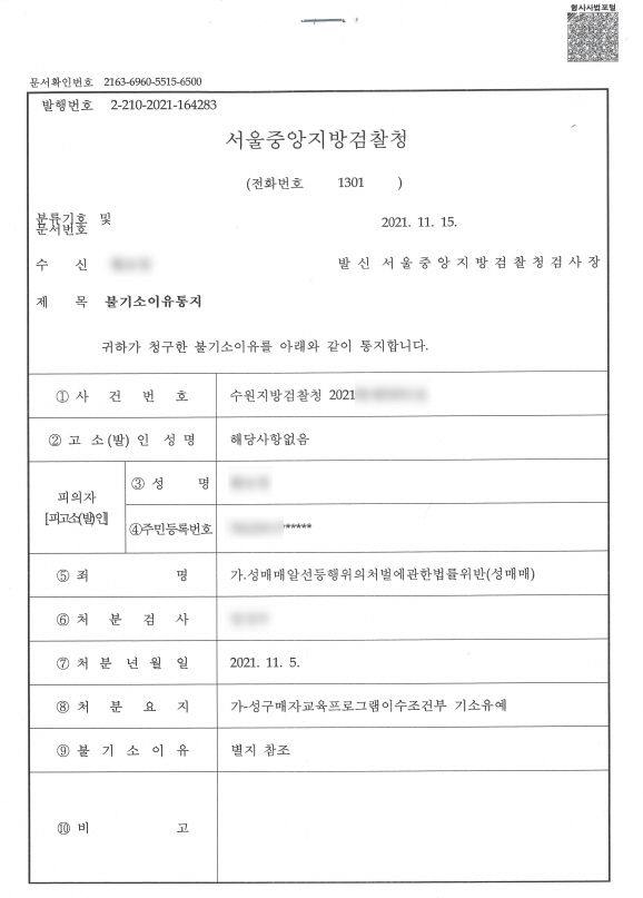 결국 검찰에서는 이를 바탕으로 의뢰인이 범죄 전력이 없고, 매매 횟수가 5회에 그친 점, 스스로 뉘우치며 철저한 반성과 함께 적극적으로 재발 방지 대책을 세운 점 등을 정상에 반영해 성구매자 재범방지 교육 이수를 조건으로 '기소유예'를 결정했습니다.