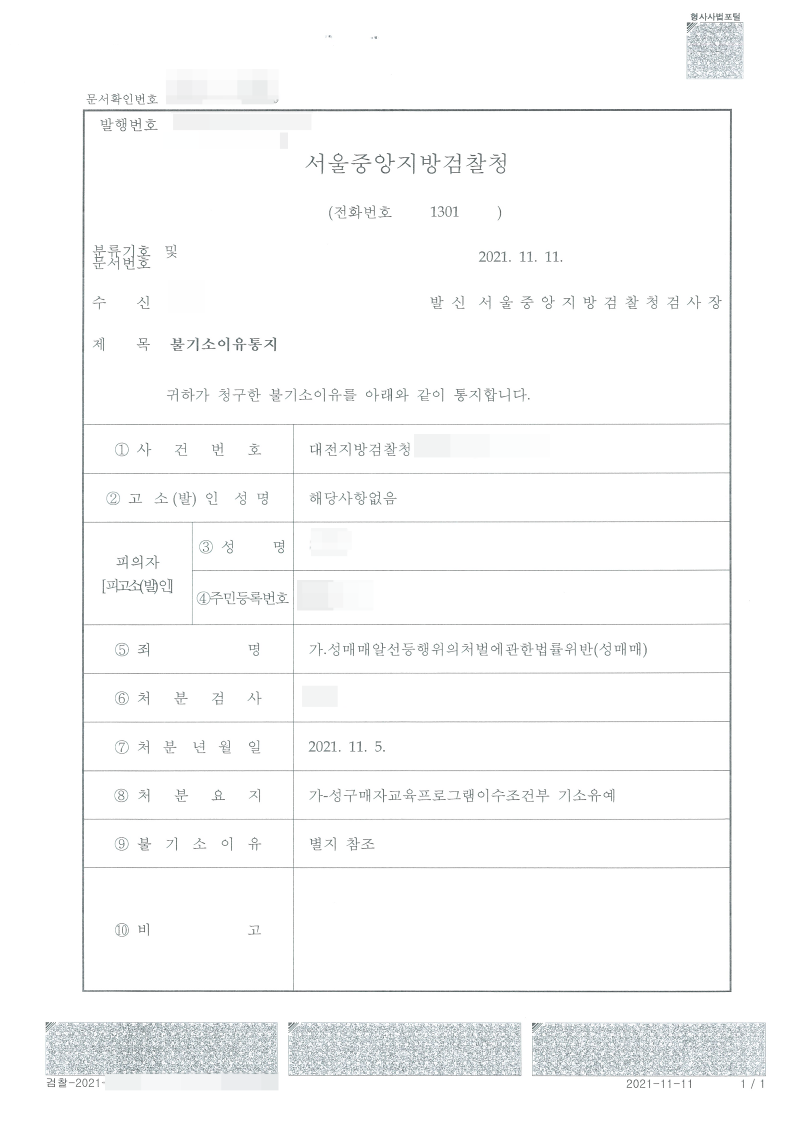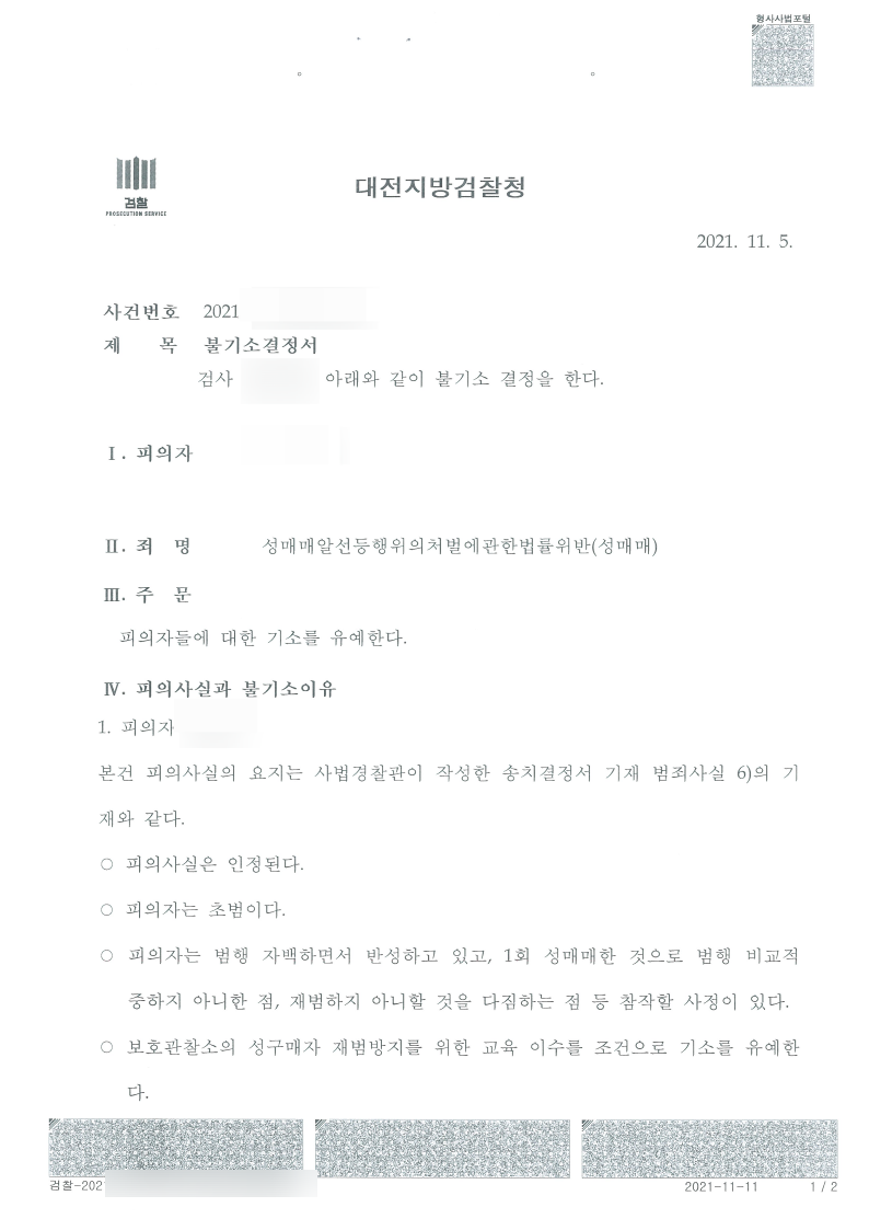검사는 최종 불기소결정서에서 의뢰인의 피의 사실은 인정하되 초범인 점, 의뢰인이 범죄 사실을 자백하고 반성한 점, 성매매 횟수가 1회에 그치고 범행이 비교적 중하지 않은 점, 그리고 재범 방지에 대한 강력한 의지를 피력한 점 등을 참작 사유로 인정해 보호관찰소 성구매자 재범방지를 위한 교육 이수를 조건으로 기소유예 결정을 내렸습니다.