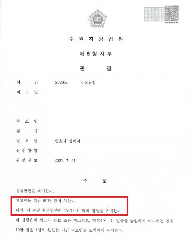 저희 의뢰인은 여행 도중 같은 숙소의 다른 일행이 머무는 방에 의사에 반하여 들어갔다는 이유로 방실침입죄로 기소되어 형사재판까지 서게 되었고, 1심에서 50만원의 벌금형을 선고받았습니다.