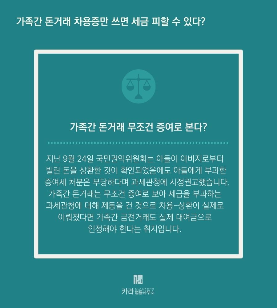 이는 가족간 돈거래는 무조건 증여로 보아 세금을 부과하는 과세관청에 대해 제동을 건 것으로 차용-상환이 실제로 이뤄졌다면 가족간 금전거래도 실제 대여금으로 인정해야 한다는 취지입니다.