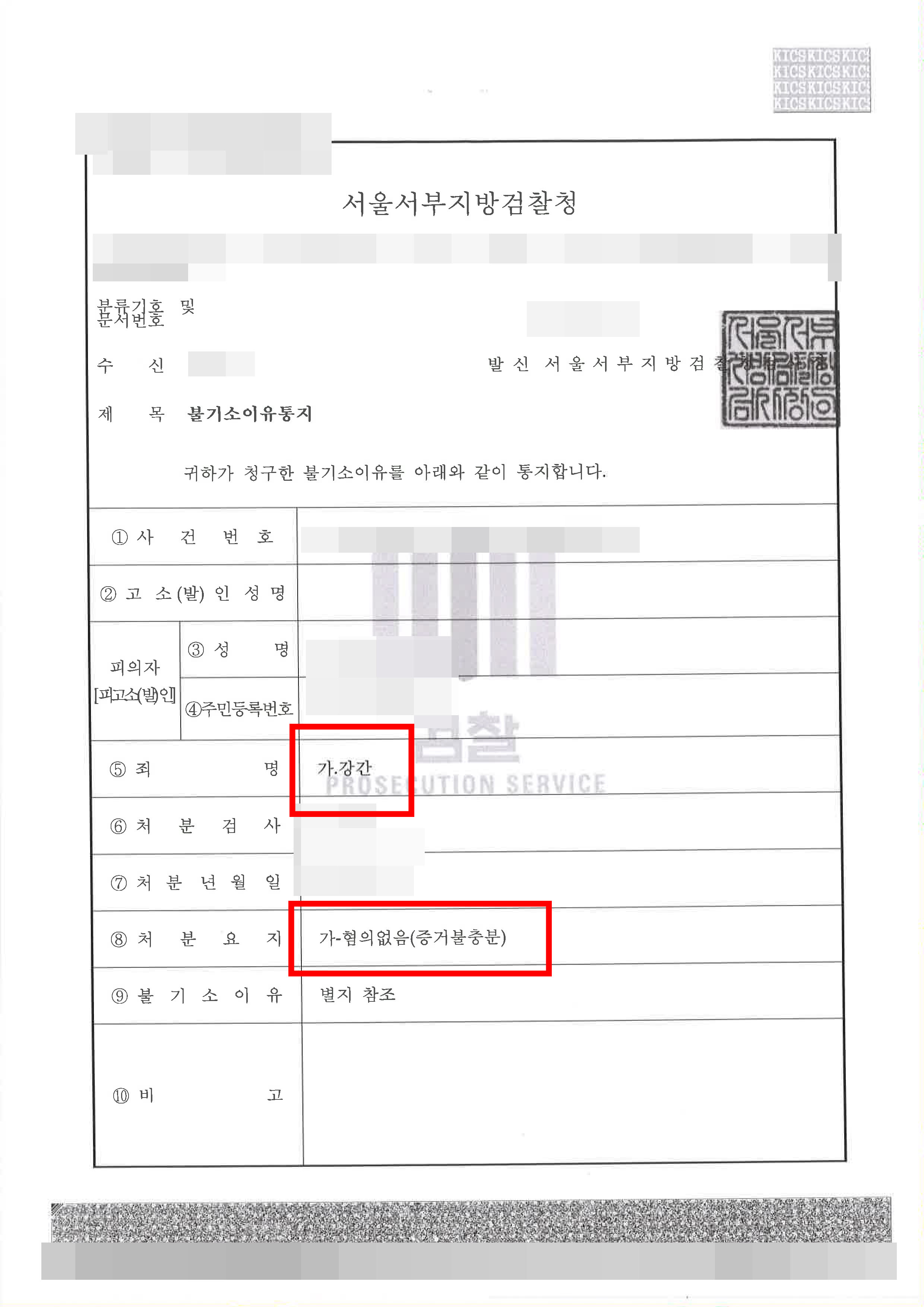 그 결과 본 변호인의 주장에 이유가 있다며 무혐의 처분이 내려졌습니다.