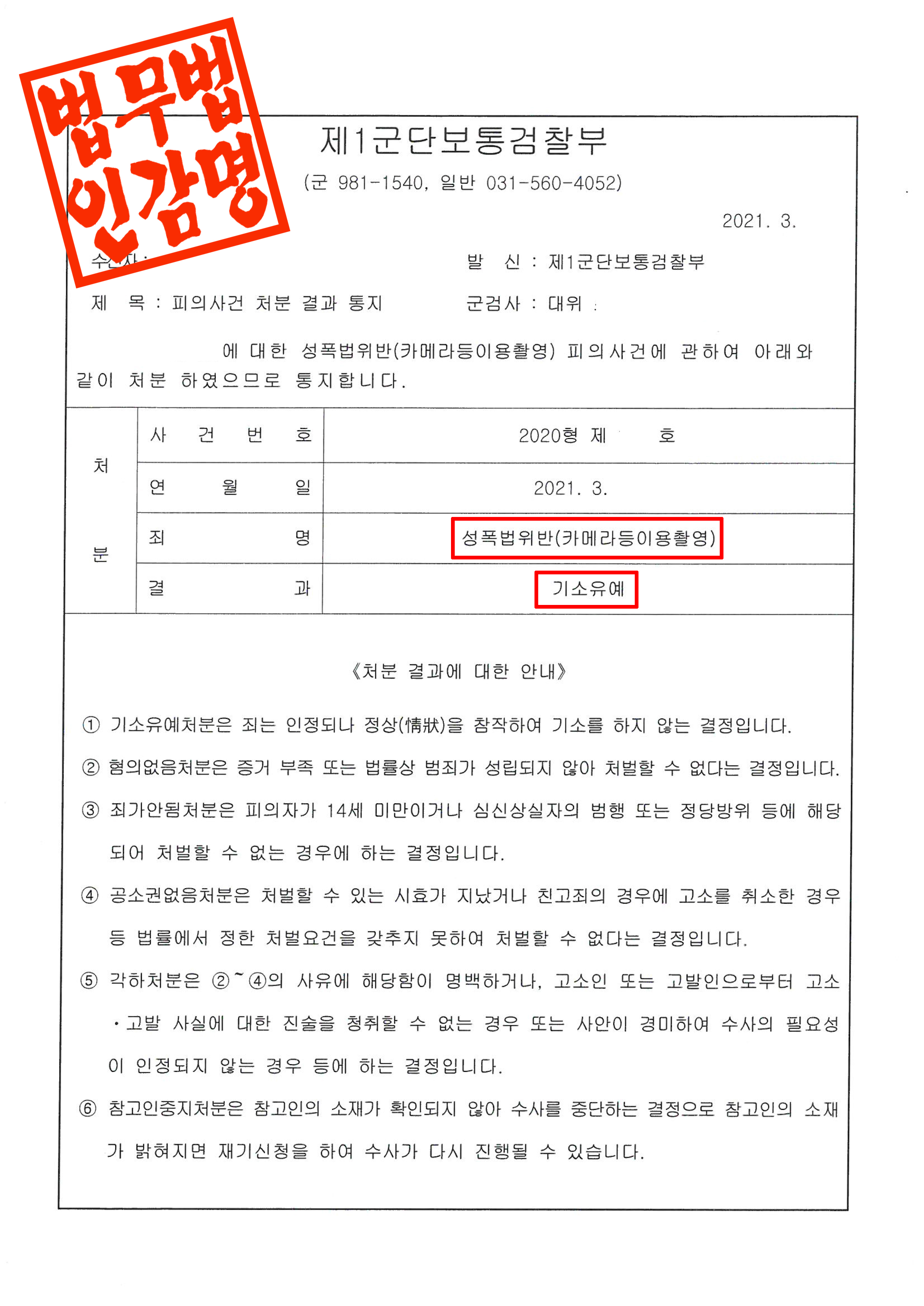 의뢰인은 수차례 진술과정에서 성적인 의도가 없었다고 주장하였으나 사진삭제를 요청하였으나 삭제를 하지 않았던 부분에 있어서는 문제가 되었습니다. 또한 의뢰인은 군인신분이었기에 헌병대로 이첩되었고 헌병대의 경우는 민간 경찰에서 사건이 진행되는 것 보다 정보를 입수하는데 난이도가 높았습니다. 군인성범죄의 경우는 일반적인 민간사건과는 다른 노하우가 요구되나 그동안 다수의 군성범죄사건을 다룬 경험을 바탕으로 정보를 수집하였습니다. 실제 촬영이 있었던 점에 대해서는 부인할 수 없는 상황이었기에 혐의는 인정하고 피해자와 합의하여 기소유예를 받는 쪽으로 목표를 잡았습니다. 아울러, 최대한 충실하게 양형자료를 수집하도록 조력하였고 합의전담팀을 통해 합의를 성공적으로 마치며 합의서 및 양형자료를 바탕으로 기소를 유예해 줄 것을 요청하였습니다.