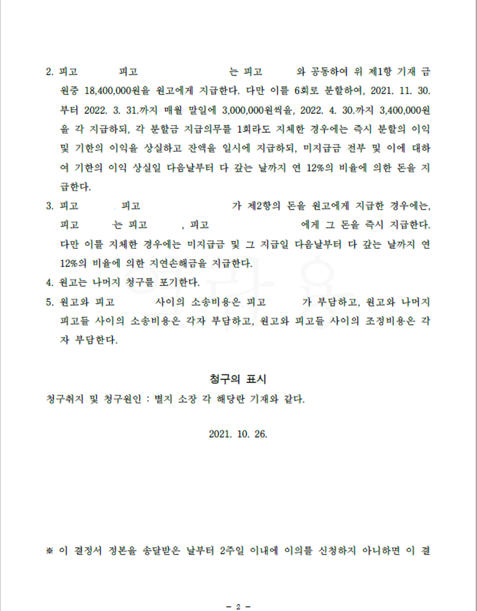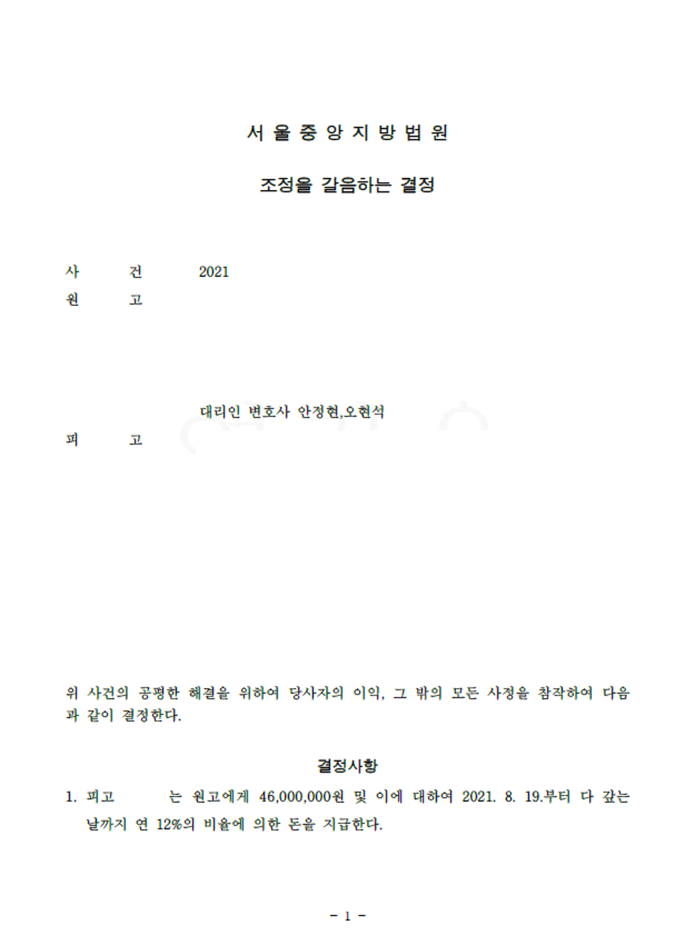 의뢰인도 임대인과 중개사의 말만 믿고 계약 진행을 하면 안 되고 본인이 직접 구체적인 자료제공을 요구하며 주의를 기울일 필요가 있습니다. 따라서 의뢰인의 일부 과실을 고려하여 본 사건의 경우 중개사 측의 책임은 40~60% 사이에서 결정될 것으로 보였습니다. 재판부에서는 양측 이야기를 토대로 강제조정결정을 하였고 중개사 및 협회가 40%의 책임을 지는 것에 양측 이의를 하지 않아 강제조정결정이 확정되었습니다.