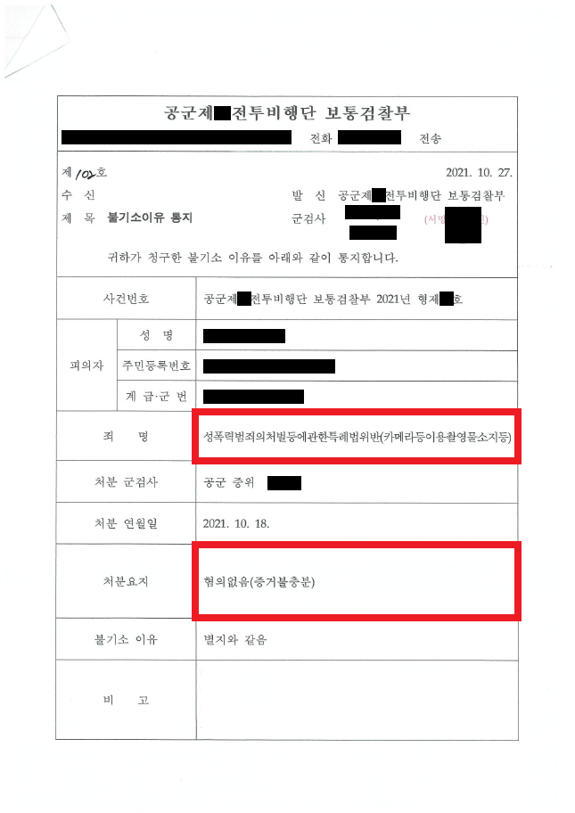 ④ 군사경찰 조사를 받은 후 "문제되는 음란물은 촬영의 내용과 각도 등에 비추어보면 촬영 대상자의 의사에 반하여 촬영된 것이라고 단정할 수 없고, 촬영 대상자가 특정되지 않아 촬영 대상자의 의사에 반하여 유포된 것이라고 확인할 수 없다. 따라서 불법 촬영물임이 입증되지 않은 이상, 이를 전제로 한 성폭력범죄의처벌등에관한특례법위반(카메라등이용촬영물소지등)죄는 성립하지 않는다."라는 내용의 변호인의견서를 작성하여 제출하였습니다.