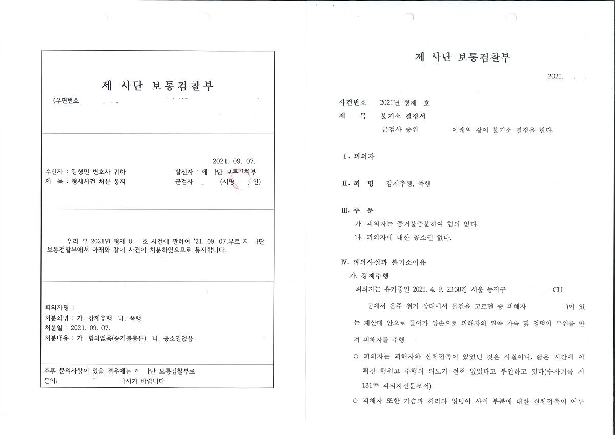 아무리 분위기상 선처를 할만한 상황이 아니라고 하더라도 피해자가 사실확인서를 제출하면서 직접 강제추행이 아니라고 밝혔고 만일 기소를 하게 되면 저는 당연히 이를 다투고 증거에 부동의할텐데 피해자가 법정에 증인으로 출석해야만 할 것입니다. 합의까지 한 상태인 이런 상황에서는 먼 거리의 군사법정에 출석시키는 것부터 어려울 것이고 공소유지가 쉽지 않을 것입니다. 출석하더라도 사실확인서 내용 그대로만 증언한다면(만일 아니라고 한다면 내용 보고 본인이 지장 찍은 것 아니냐는 추궁을 할 것이므로 아니라고 하는 상황은 쉽지 아니함) 무죄판결이 나오기 쉬운 상황이었습니다.