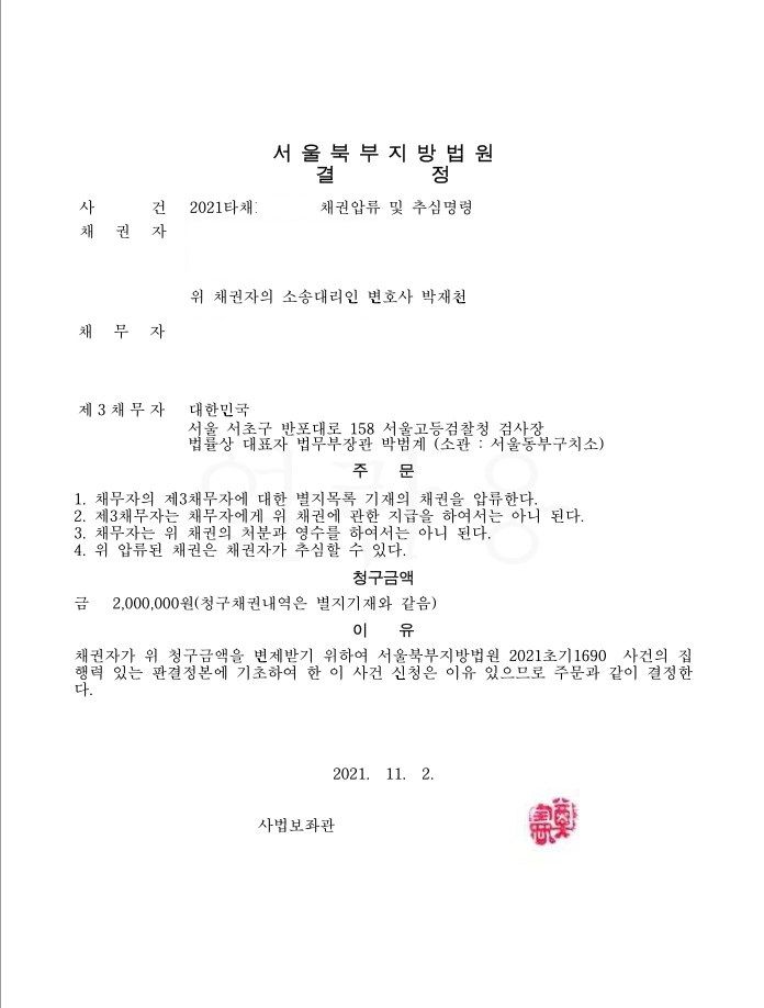 이때 피해자는 자신이 상대방에게 대하여 가지고 있는 손해배상채권에 기한 압류, 추심명령 신청을 할 수 있습니다. 교도소나 구치소에 수감된 사람에 대하여는 노역비, 영치금 채권이 존재할 수 있습니다. 그에 대한 압류를 통해 상대방에게 현실적인 변제를 유도할 수 있습니다. 본 사안은 부동산 갭투자 사기로 징역형에 처한 가해자에 대하여 피해자가 교도소의 영치금, 노역비를 압류, 추심한 사례입니다.