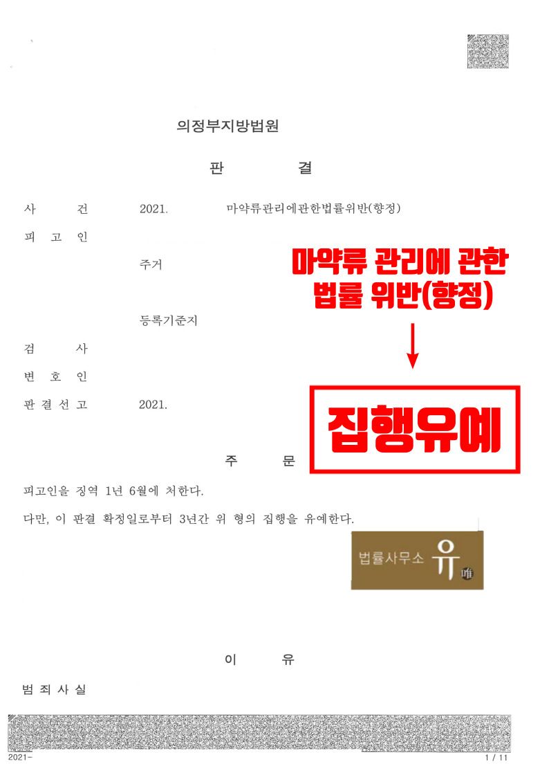 의정부지방법원 고양지원은 의뢰인의 범죄사실을 인정하면서도, 의뢰인의 치료 및 재활의지 등을 상세하게 부각하여 정리한 법률사무소 유(唯) 마약전문변호사의 변호인의견서 등의 내용을 대폭 수용하여 피고인(의뢰인)에게 집행유예를 선고하였습니다.