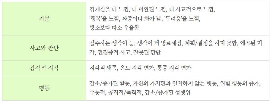 남용되는 약물은 우리의 기분, 사고와 판단, 감각적 지각 및 행동에 아래와 같은 변화를 일으킵니다.
