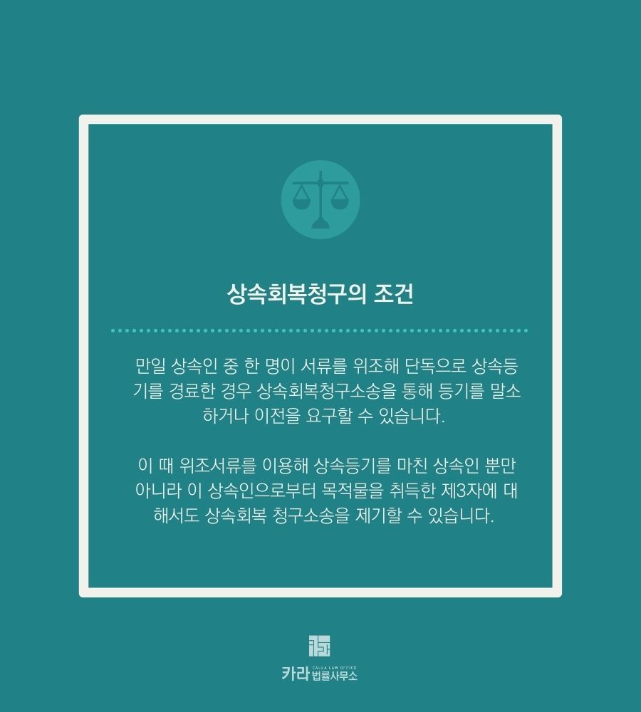 만일 상속인 중 한 명이 서류를 위조해 단독으로 상속등기를 경료한 경우 상속회복청구소송을 통해 등기를 말소하거나 이전을 요구할 수 있습니다.
