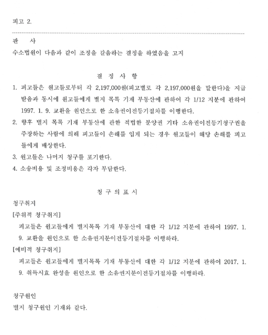 재판 절차 중에 법리적인 주장을 계속하면서도, 의뢰인의 모친이 건설회사들과 사이에서 20년 전 합의한 내용대로 정산금을 지급할 의무가 있다고 판단이 되어 재판부에 조정절차의 진행을 요청하였고 피고 회사들도 이에 어느 정도 수긍하여, 결국 법원의 강제조정으로 20여년 전 합의했던 대로 의뢰인들이 건설회사들에게 일부 대금 및 미지급 부가세를 지급하기로 하고 건설회사들은 소유권등기를 원고들에게 모두 이전하기로 하는 결정이 되