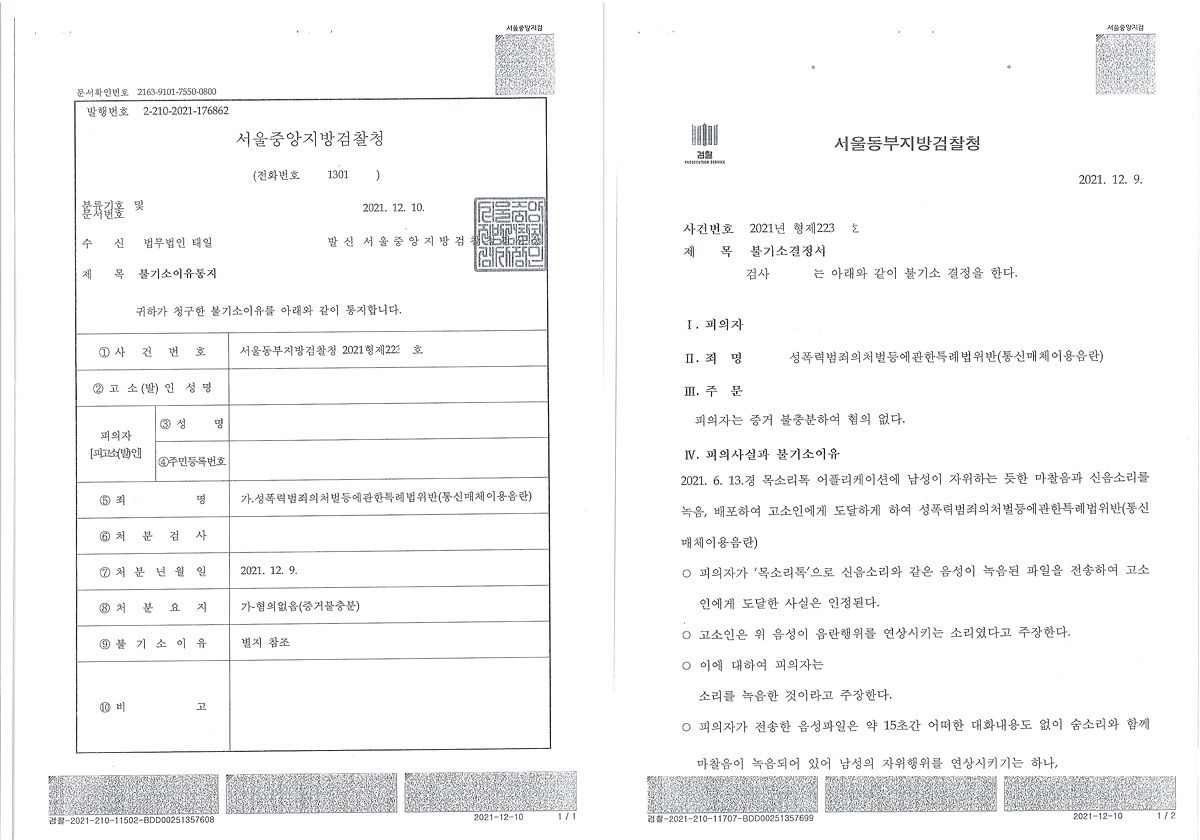 성폭력범죄의 처벌 등에 관한 특례법 통매음에 관하여 추가로 1건의 불기소처분과 2건의 불송치결정을 받았습니다. 목소리톡으로 촉발된 대량고소 사건 이후 성폭력범죄의 처벌 등에 관한 특례법 통매음에 관하여 혐의없음 불기소처분과 불송치결정을 받은 것이 총 30건을 넘어섰습니다.