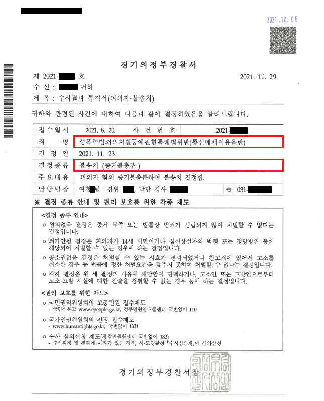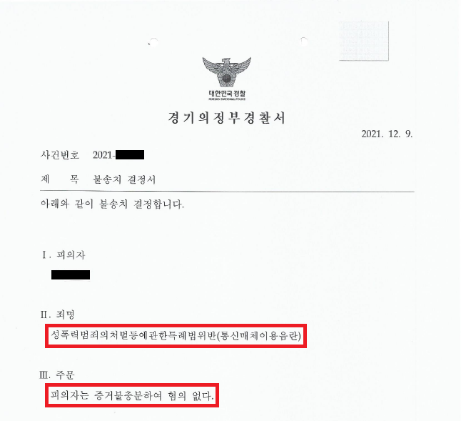 이러한 저의 조력을 바탕으로 A씨는 '불송치(혐의없음)' 결정을 받음으로써 억울하게 성범죄자가 될 위기에서 벗어날 수 있었습니다.
