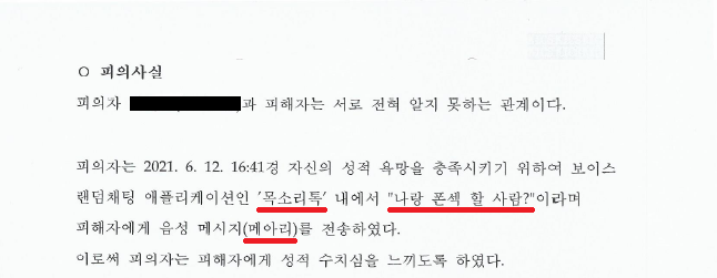 그런데 이로부터 약 4달의 시간이 흐른 뒤 어느 날, A씨는 경찰로부터 "누군가가 '목소리톡'에서 A씨의 메아리를 받고 성적 수치심을 느꼈다며 고소를 하여 조사를 받아야 한다"라는 전화를 받게 되었습니다.
