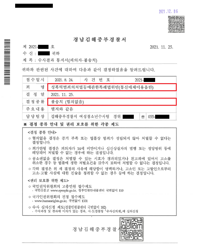 이러한 저의 조력을 바탕으로 A씨는 '불송치(혐의없음)' 결정을 받음으로써 억울하게 성범죄자가 될 위기에서 벗어날 수 있었습니다.