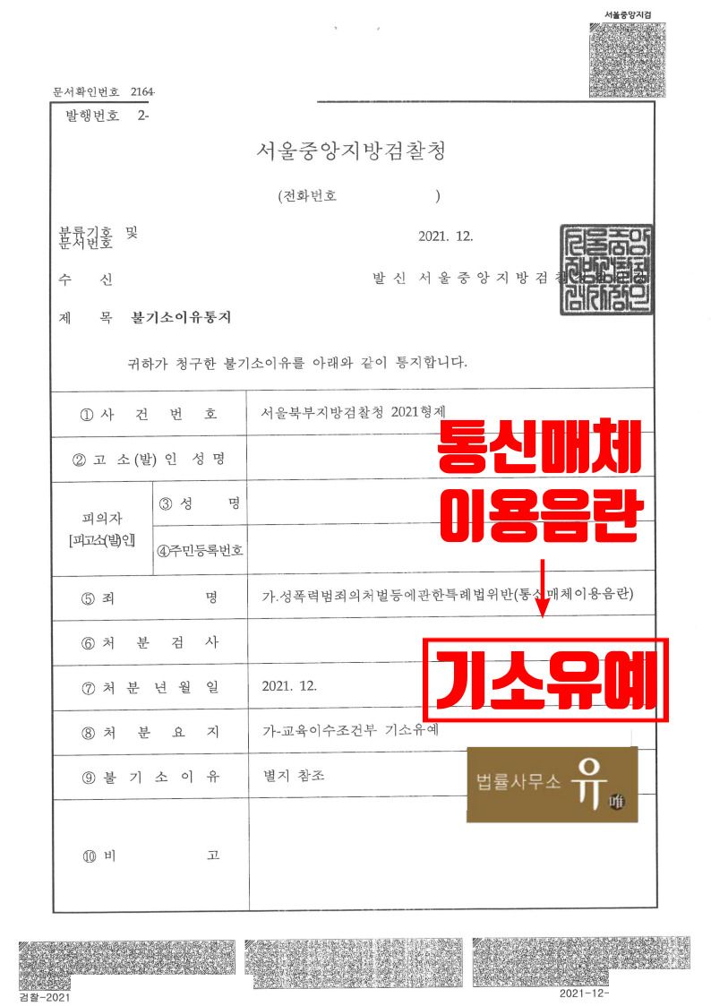 서울북부지방검찰청은 법률사무소 유(唯)의 형사전문변호사가 작성한 변호인의견서 내용을 대폭 반영하여 피의자(의뢰인)에게 기소유예처분을 하였습니다.