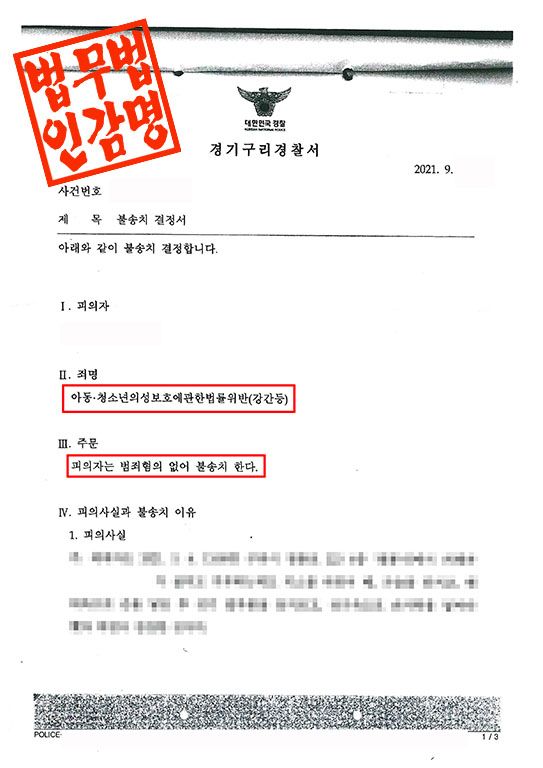 경기구리경찰서는 이 사건에 대해 다음과 같은 사유로 불기소 처분을 하였습니다.