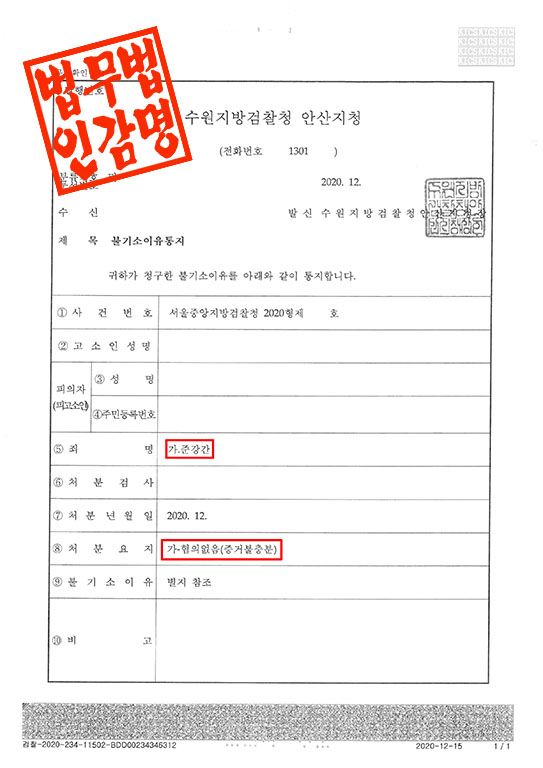 서울중앙지방검찰청은 이 사건에 대해 다음과 같은 사유로 불기소 처분을 하였습니다.