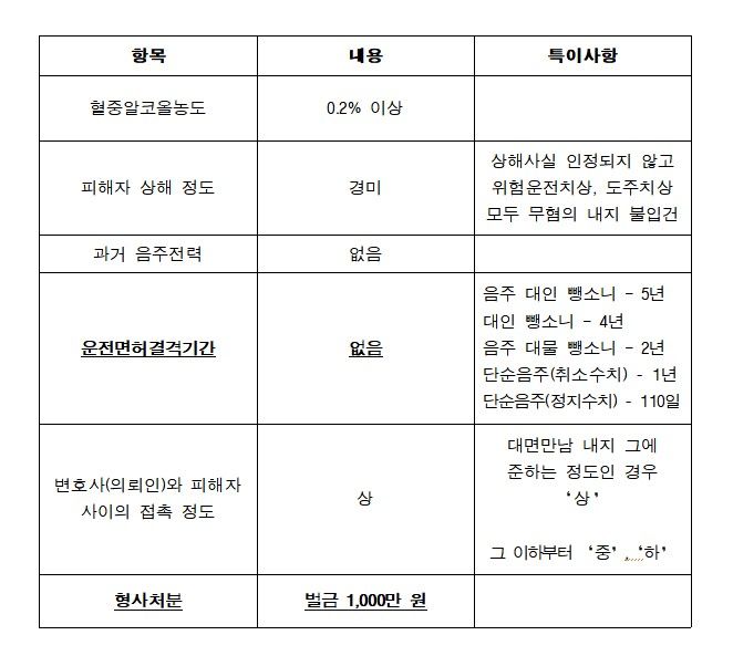 의뢰인의 혈중알콜농도가 0.2% 이상이었으므로 의뢰인은 음주운전 뿐만 아니라 특정범죄가중처벌등에관한법률(위험운전치상)죄로 기소될 위기에 처하여 변호인을 선임하였습니다.