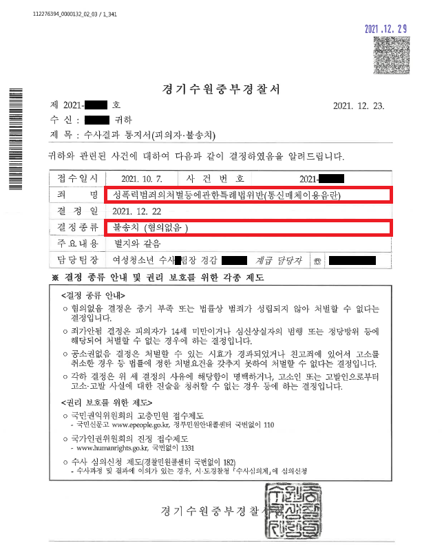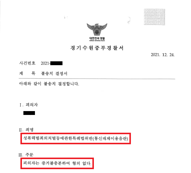 이러한 저의 조력을 바탕으로 A씨는 전혀 모르는 사람에게 다짜고짜 성기사진을 전송하였음에도 불구하고 '불송치(혐의없음)' 결정을 받음으로써 성범죄자가 될 위기에서 벗어날 수 있었습니다.
