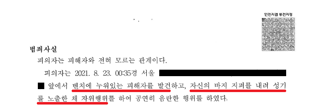 회사원 A씨는 친구들과 술을 마시고 만취한 상태로 집으로 돌아가다가 벤치에 누워있는 여성 B씨를 발견하고 바지 지퍼를 내려 성기를 노출한 채 자위행위를 하였습니다. B씨는 화들짝 놀라 A씨를 경찰에 신고하였고, 얼마 뒤 A씨는 공연음란 혐의로 조사를 받게 되었습니다.