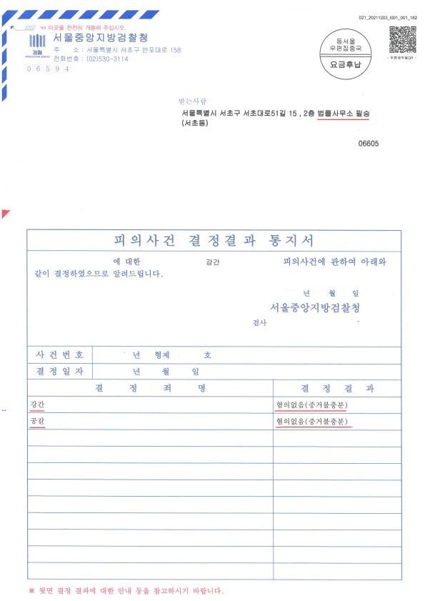앞서 말씀드린 다양한 방법으로 경찰, 검찰 수사 단계를 신중히 진행하였고 이에 서울중앙지방검찰청은 의뢰인님에게 강간죄 및 공갈죄에 대하여 모두 "불기소처분(무혐의)"을 하였습니다.