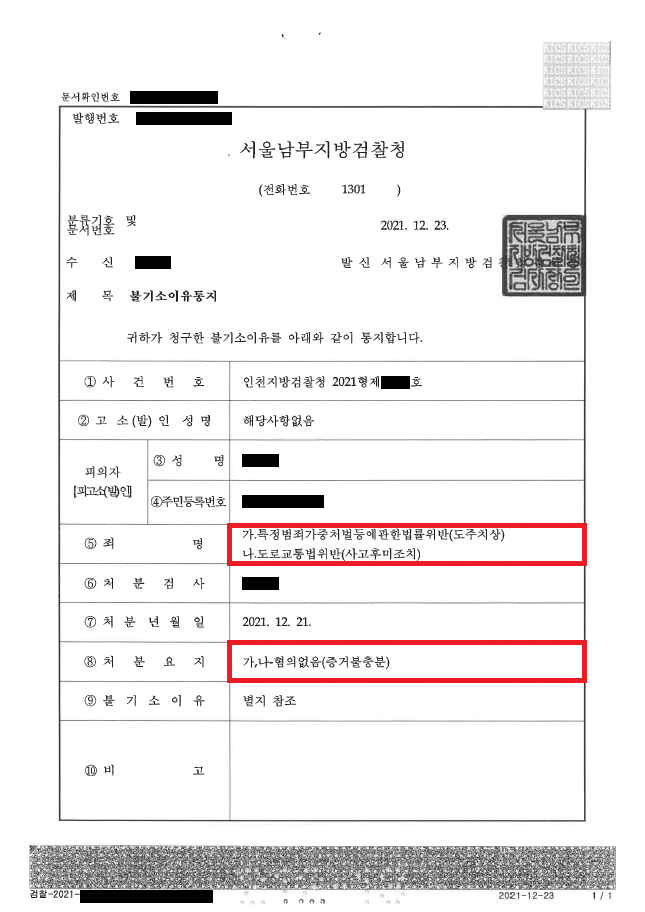 이러한 저의 조력을 바탕으로 A씨는 경찰이 혐의가 인정된다고 판단하여 사건을 검찰에 송치하였음에도 불구하고 '혐의없음(증거불충분)' 처분을 받음으로써 억울한 누명에서 벗어날 수 있었을 뿐만 아니라 면허도 그대로 유지하여 생계를 이어나갈 수 있었습니다.