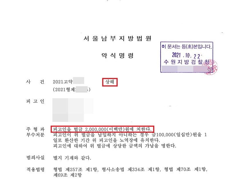 법률사무소 가온길의 고소대리로 상대방은 벌금 200만 원의 구약식처분을 받게 되었고, 의뢰인은 처벌을 면하게 되었습니다.