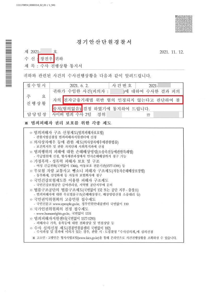 법률사무소 가온길의 주장이 인정되어 의뢰인은 전자금융거래법 위반 혐의를 벗고 불송치(혐의없음) 결정을 받을 수 있었습니다.