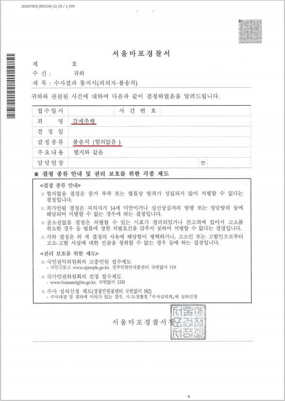 ※ 이에 서울마포경찰서는 의뢰인님의 "강제추행"에 대하여 불송치(혐의없음)을 한 사건입니다.