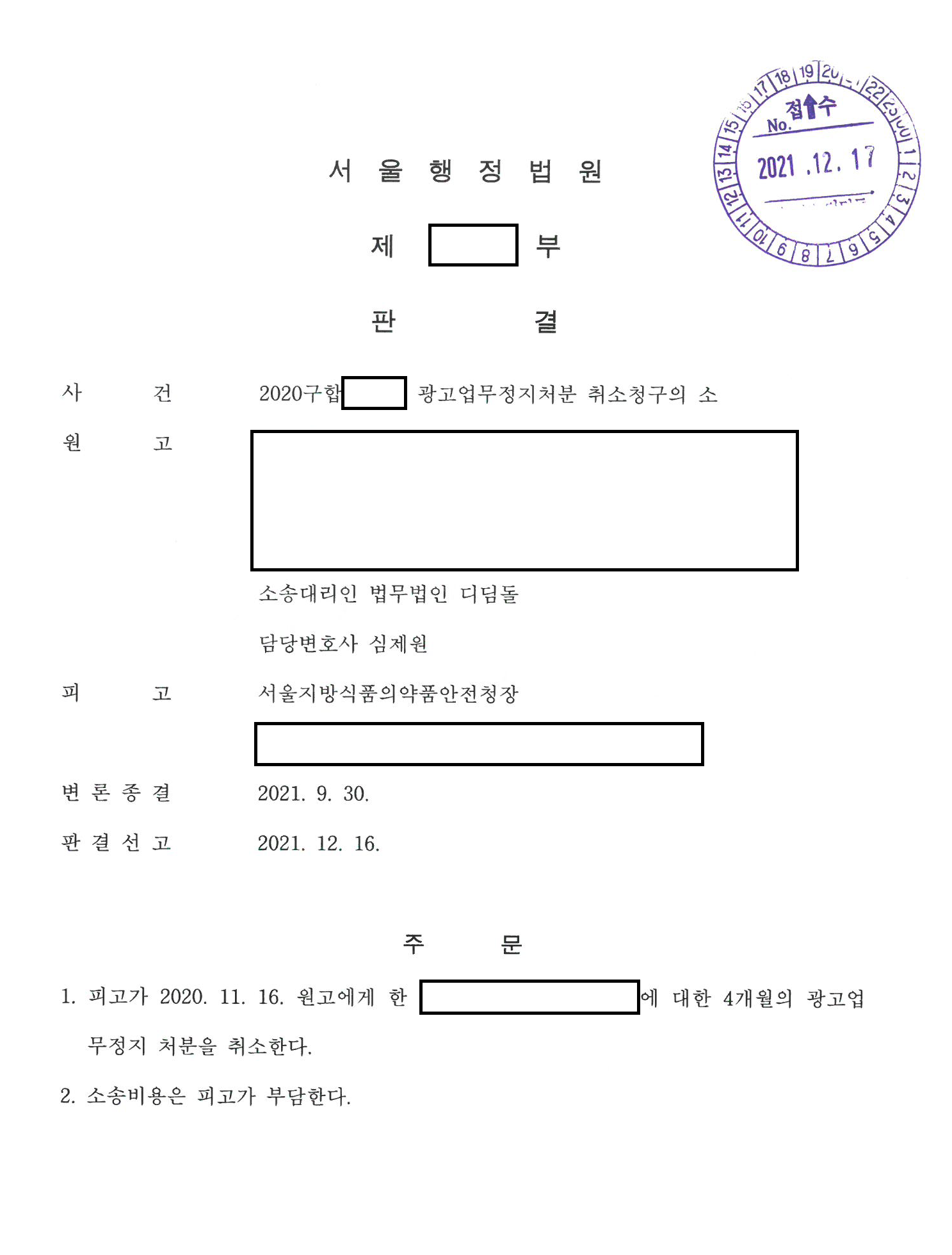 지난 12월 선고된 행정법원 사건을 포스팅합니다. 4개월간 광고업무정지처분을 하도록 한 식약처(서울지방식품의약품안전청)의 처분을 취소하라는 승소판결입니다. 약 1년이 걸렸네요. 처분의 사전통지가 있었고, 바로 본안 소장과 집행정지를 신청해서 집행정지가 인용되었습니다. 그리고 본안에서도 승소 판결이 나온 것입니다.