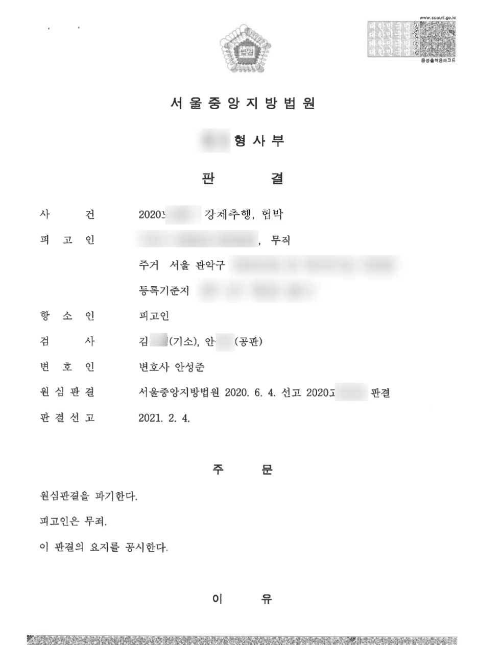 수사단계와 1심 단계에서 피해자 진술의 맹점을 지적하고 신빙성이 결여되어 있다는 점을 지적하였다면 보다 손쉽게 사건을 마무리지을 수 있었던 사건이었습니다만, 아쉽게도 1심 판결 후 선임된 사건이었습니다. 증거기록상 유일한 유죄의 증거는 피해자의 진술이었습니다만, 그 진술의 신빙성이 결여되어 있다는 점을 집중적으로 조명하고 법원으로부터 인정받을 수 있었습니다.