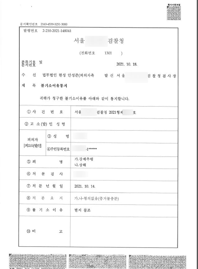 불기소 처분 - 혐의없음(증거불충분)