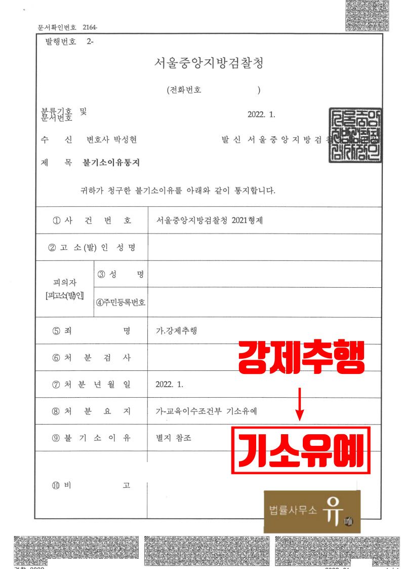 서울중앙지방검찰청은 법률사무소 유 형사전문변호사의 변호인의견 등을 적극적으로 받아들여 피의자(의뢰인)에 대하여 강제추행 혐의가 인정되지만 피의자가 초범이고 우발적 범행인 점과 피의자가 반성하고 있다는 점 등을 이유로 교육조건부 기소유에 처분을 하였습니다.