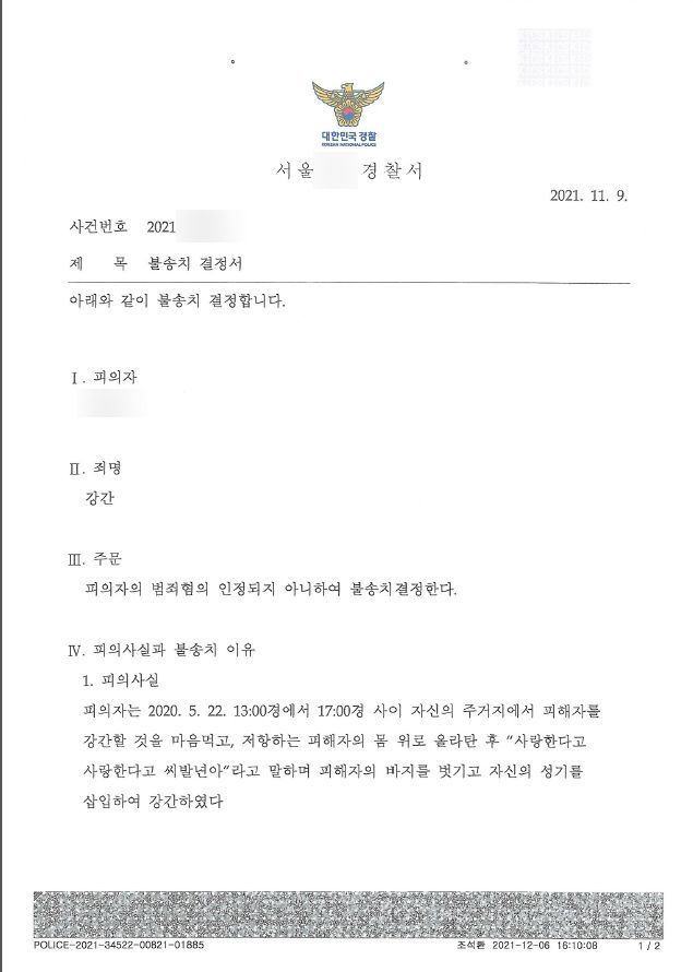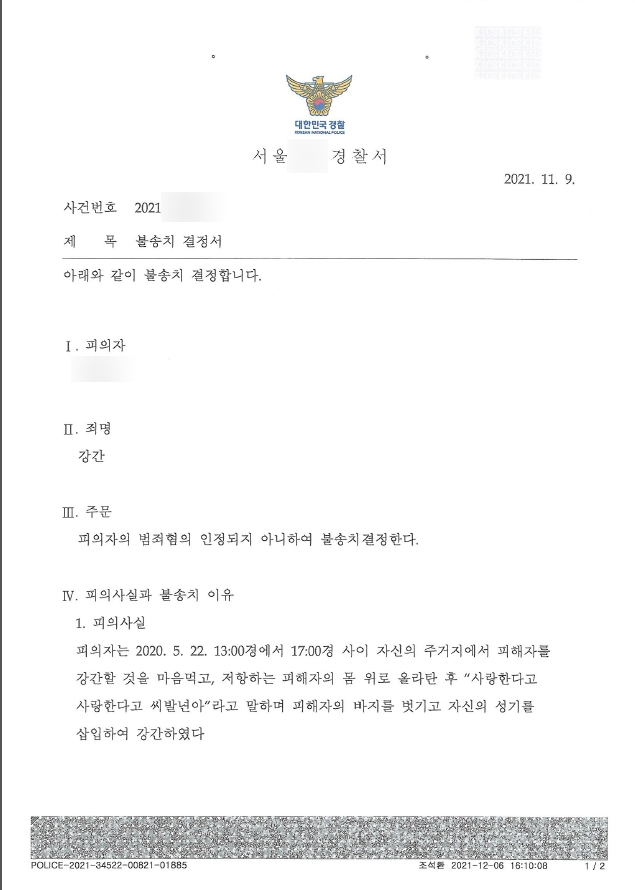 경찰의 불송치 결정(혐의없음)을 받았습니다.