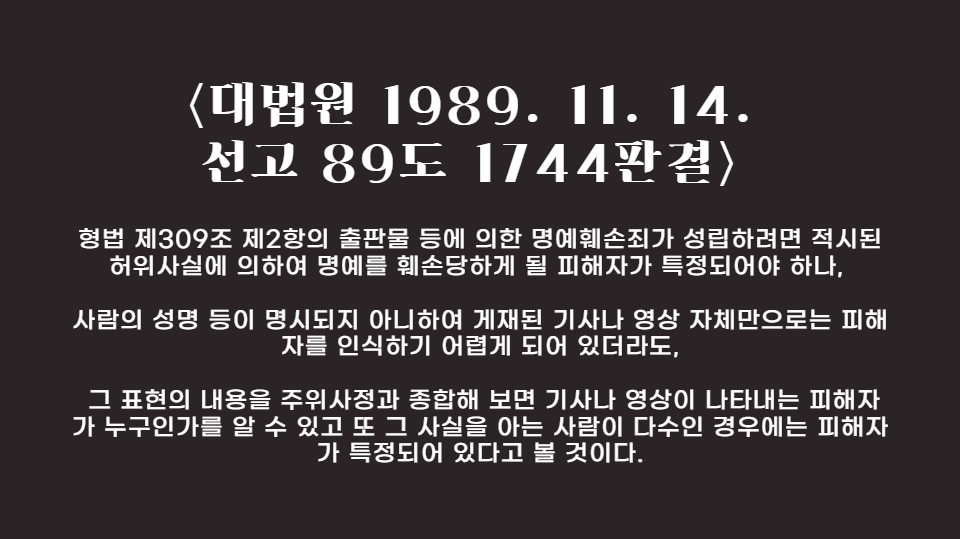 이상으로 명예훼손 성립요건의 핵심 "특정성"에 대해서 설명드렸습니다.