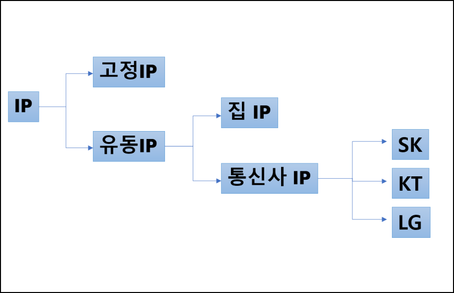 유동 IP의 경우에는 집 IP(랜선 또는 와이파이 공유기), 통신사 IP(모바일 데이터)로 구분할 수 있습니다.