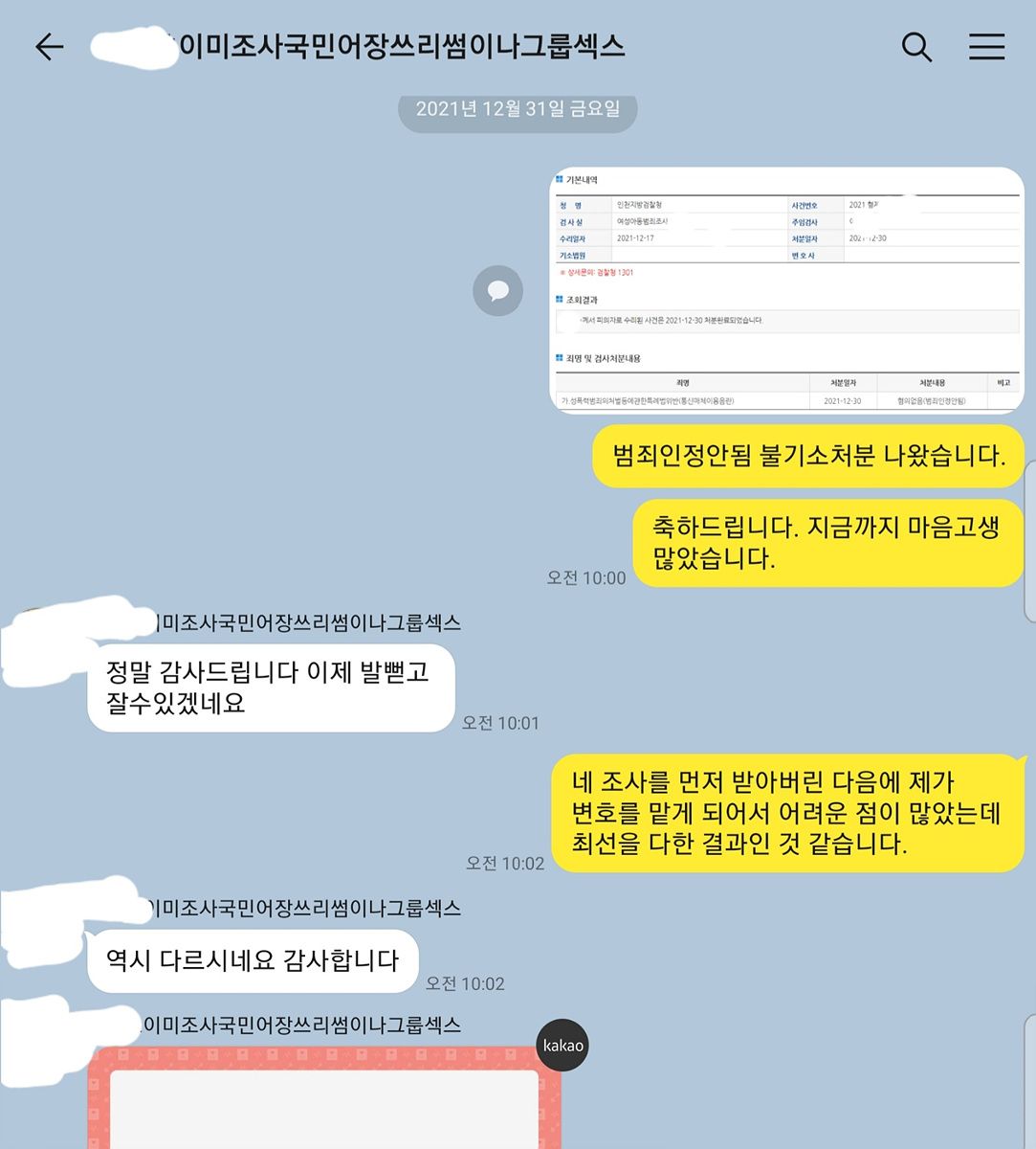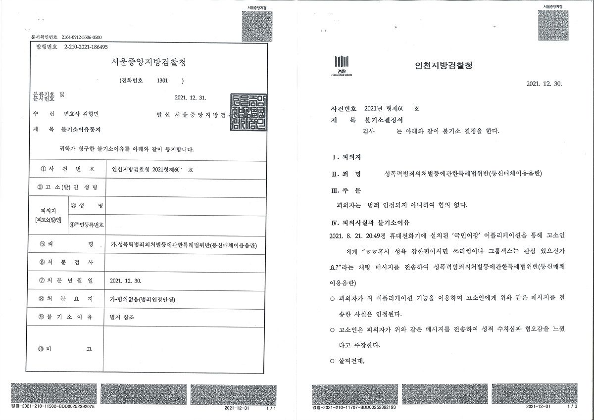 채팅의 수위가 높은 편이기는 하나 현행 형사처벌규정이 미비되어 불가벌인 사안과의 형평성 등을 포인트로 다양한 내용의 의견서를 제출하였고 결과적으로 혐의없음 불기소처분을 받을 수 있었습니다. 이 사안에서는 목소리톡 메아리가 아님에도 특이하게 증거불충분이 아닌 범죄인정안됨 혐의없음 처분이 내려졌습니다.