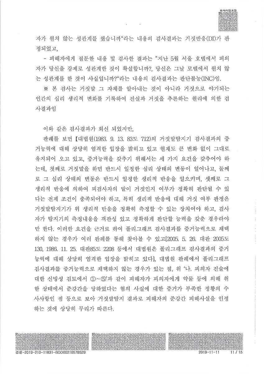 이 사안에서도 거짓반응이 나오기는 하였으나 거짓말탐지기 거짓반응 결과에도 불구하고 불기소처분이 내려진 불기소이유서를 비롯하여 충실한 의견서를 제출한 결과 불송치 결정을 받을 수 있었습니다.