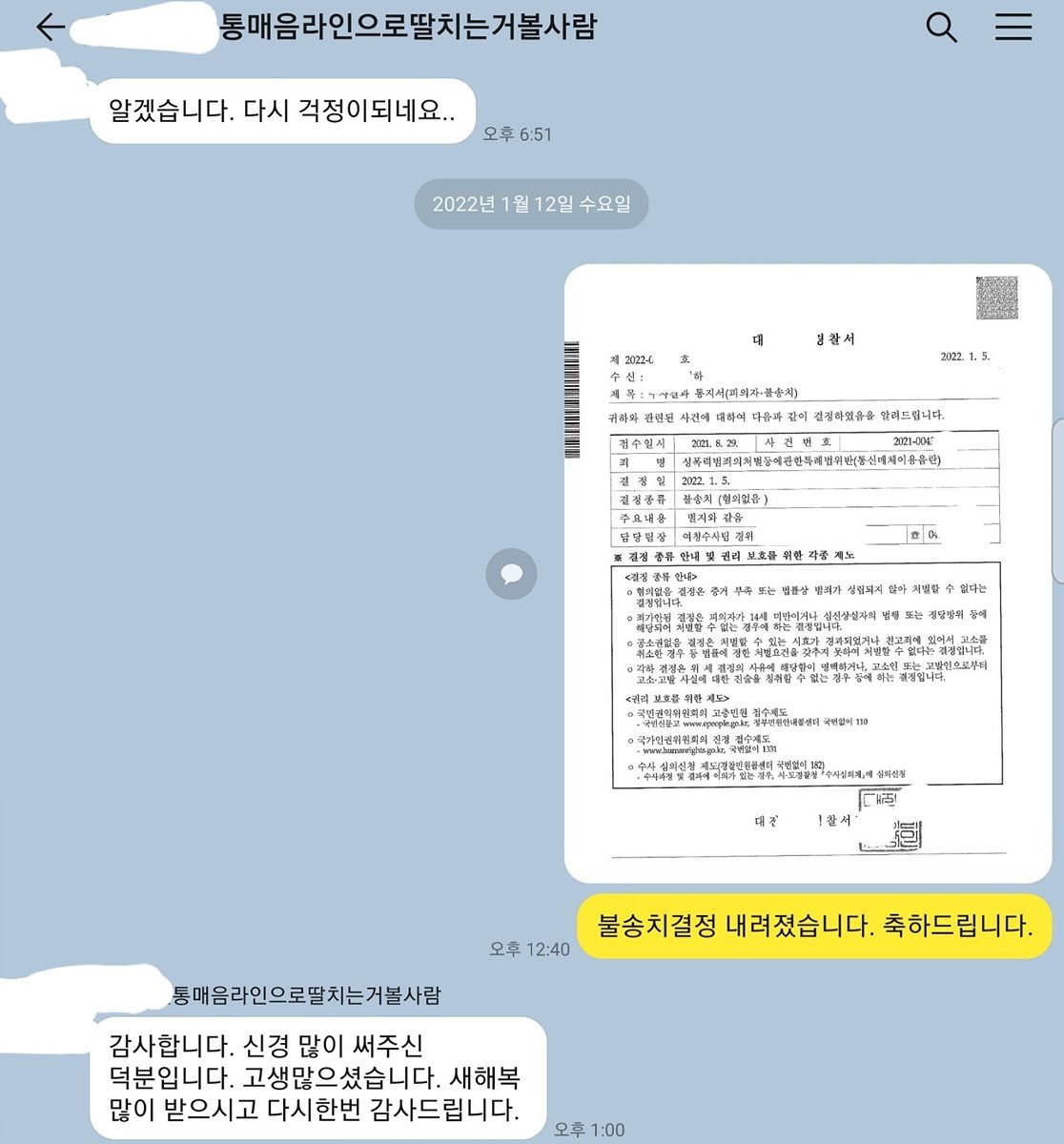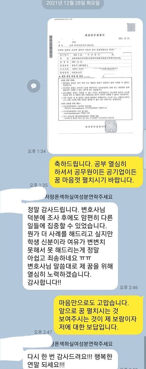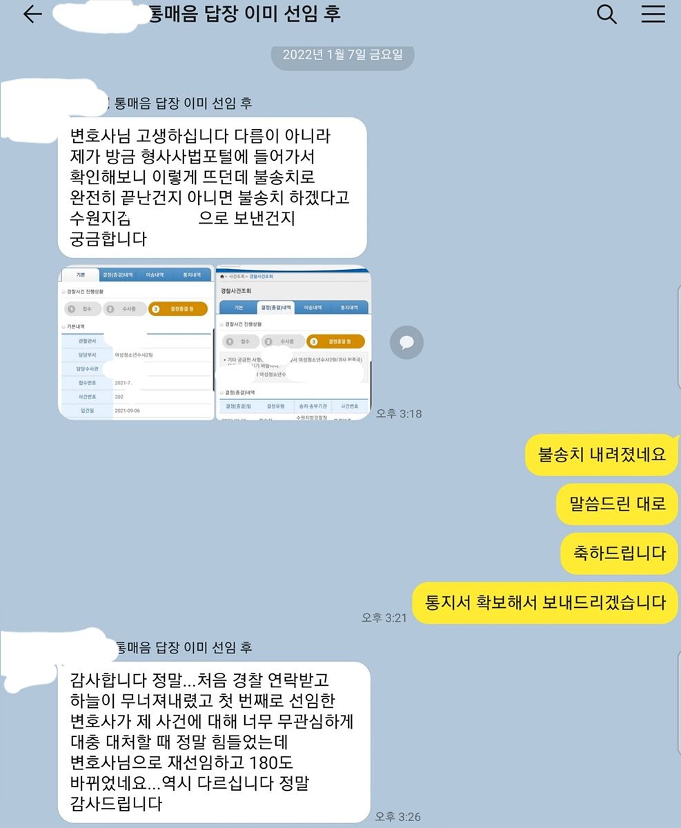 이 사건의 경우 오랜 시간 공무원시험을 준비하는 사람이었기 때문에 이 일로 인하여 자칫 지금까지 노력이 물거품이 될 수도 있는 사인이었습니다. 이와 비슷한 멘트로 이미 통매음으로 벌금형이 선고된 판례가 있어 그 판례를 근거로 약식기소되는 경우도 다수 있는 것으로 알고 있습니다. 그러나 거의 같은 멘트로 불송치결정, 불기소처분을 직접 받은 사례들이 있어 이를 제출하였고 결과적으로 불송치결정을 이끌어낼 수 있었습니다.