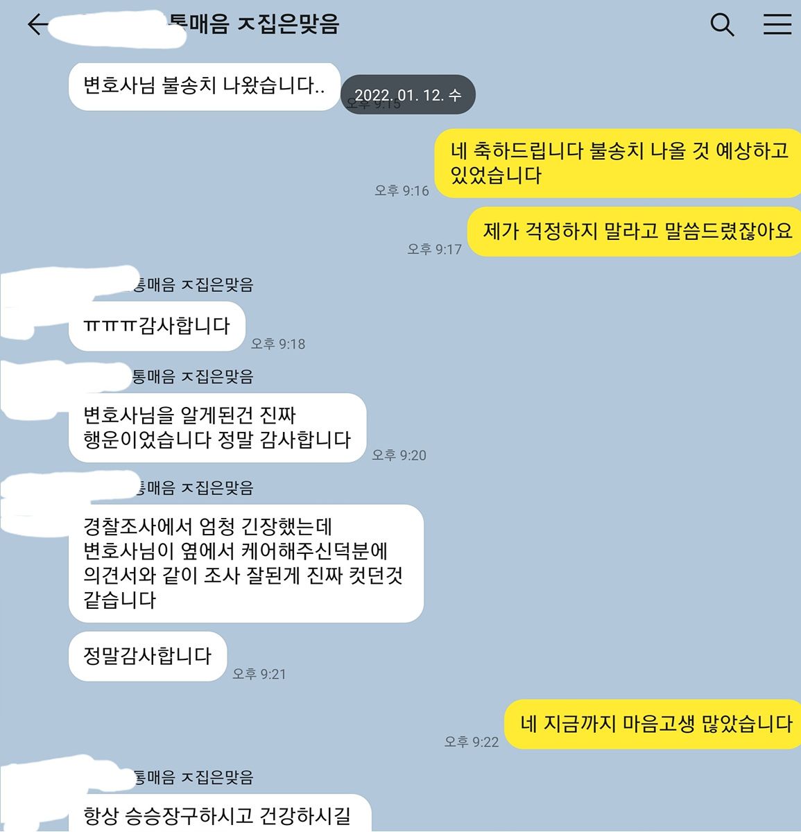 이 사건은 크리스마스 다음날에 조사입회를 하였던 사안입니다. 날씨는 매우 추웠고 저녁 조사 입회였습니다. 수사관분이 처음부터 유죄의 심증을 가지고 있어 조사를 받으면서 애로사항은 있었습니다. 그러나 사전에 수집한 증거자료들이 주효하게 작용하였고 더불어 제출한 판례가 결정적이었다고 판단하고 있습니다. 증거자료의 수집은 당사자에게 맡겨두면 전혀 제대로 수집하지 못하는 것이 현실입니다. 기존 사건에서 수집된 증거를 보여주고 이런 식으로 자료를 수집하면 된다고 구체적으로 알려주어야 제대로 된 증거가 수집될 수 있지 당사자에게만 맡겨두면 절대 안 될 것입니다. 이런 측면에서도 변호사에게 통매음 사건을 다수 처리해 본 경험이 있는지를 선임 전 확인하는 것이 반드시 필요한 것 같습니다.