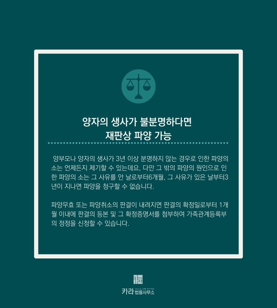 양자의 생사가 3년 이상 분명하지 않은 경우에는 재판상 파양 신청이 가능한데요, 여기서 “생사가 분명하지 않은 경우”란 양자가 살아 있는지 죽었는지를 전혀 증명할 수 없는 상태를 말합니다.