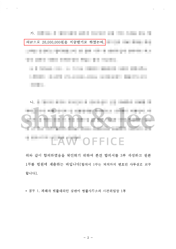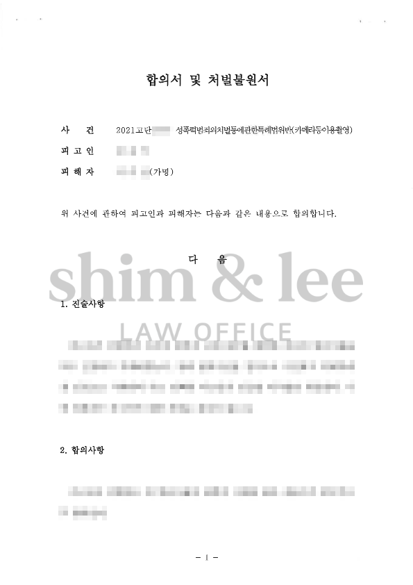 일회성 카메라등이용촬영죄에서는 매우 높은 수준인 2,000만 원으로 합의할 수 있었고, 가해자가 대학 선배인 점을 고려해서 접근금지 및 비밀유지 조항도 특히 신경써서 조율했습니다.