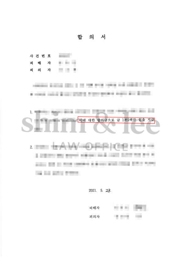 가해자가 동생의 친구라는 점 때문에 의뢰인이 무조건적인 처벌이나 고액의 합의금을 원하는 상황은 아니었기 때문에 적정한 수준인 1,500만 원에서 합의하여 사건을 마무리하게 되었습니다.
