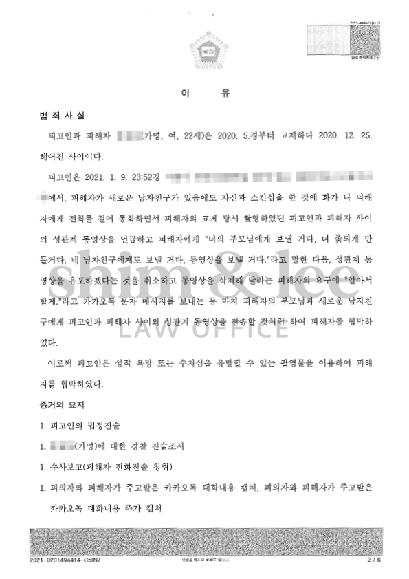 가해자는 다음 날 갑자기 의뢰인에게 전화를 하더니, 이전에 사귈 당시에 찍었던 성관계 동영상을 의뢰인의 부모님께 보내겠다, 새로운 남자친구에게도 보내겠다며 악질적인 협박을 했습니다.