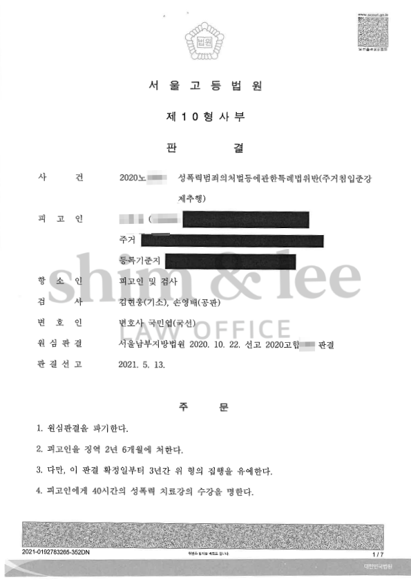 즉시 잠에서 깬 의뢰인은 너무 놀라 가해자를 밀쳐내고 방에서 뛰쳐나가 1층 프론트로 가서 경찰에 신고했으며, 가해자는 호텔 내에서 현행범으로 체포되었습니다.