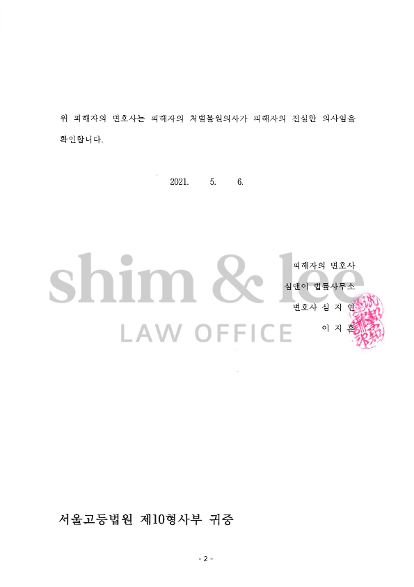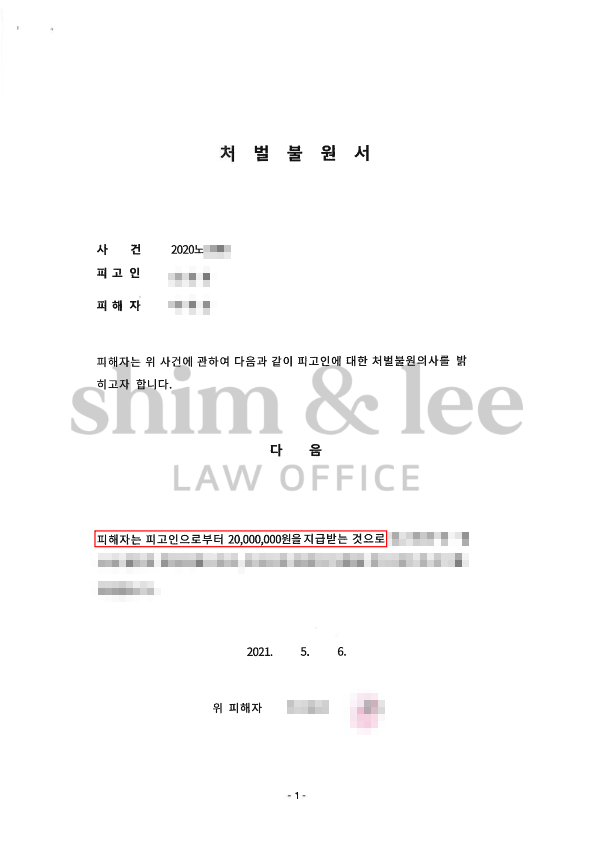 충분한 금액까지 상향시키는 데 굉장히 많은 시간이 걸리기는 했으나 결과적으로 의뢰인의 희망 금액이었던 2,000만 원으로 합의에 성공할 수 있었습니다.