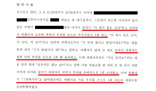 A씨는 친구들과 술을 마시고 집으로 돌아가기 위하여 고속버스터미널로 갔습니다. 그런데 앉아있는 여성 B씨에게 갑자기 "이 돼지 같은 년아"라고 말하면서 허벅지를 주무르고 어깨 부위를 움켜쥐고 허벅지를 쓰다듬었습니다. 이에 B씨가 "그만하시라"라고 말하며 거부 의사를 밝혔으나, A씨는 계속하여 B씨의 가슴을 만졌습니다.
