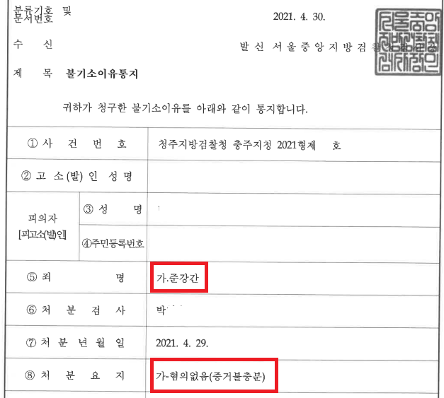 검사는 본 변호인의 주장을 전부 받아들여 "피해자의 진술이 일관되지 않고 허황된 부분이 있으며, 오히려 객관적인 증거들은 피의자의 주장에 부합한다.", "사건 당일 피해자는 심신상실 또는 항거불능 상태에 있었다고 보기 어렵고, 신빙성이 없는 피해자의 진술만을 근거로 형법 제299조의 준강간죄를 피의자에게 적용하여 기소하는 것은 적합하지 않다.", "이에 더하여 사건발생일 이전 및 이후의 다른 대화내용을 살펴보더라도 합의하에 성관계를 가진 것으로 보이므로 본 사건에 대해 형법 제297조 강간죄를 적용할 수도 없다."라며 혐의없음 처분하였습니다.