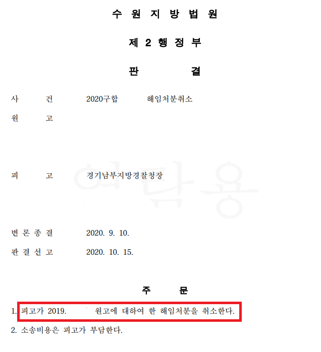 재판부는 본 대리인의 주장을 받아들여 "이 사건 비위행위의 비위정도는 통상적으로 해임처분이 이루어지는 비위행위의 정도에 비하여 비교적 가벼운점, 그런데 해임은 공무원으로서의 지위를 박탈하는 내용의 중징계처분으로···그로 인해 원고가 입는 불이익이 매우크고, 해임보다 가벼운 처분으로도 이 사건 처분을 통해 달성하고자 하는 경찰공무원 기강의 확립이나 사회적 신뢰 회복 등 공익을 달성할 수 있을 것으로 보이는 점 등을 종합하여 볼 때, 이 사건 처분은 비례의 원칙의 한계를 일탈한 것으로서 여기에는 재량권 일탈 ·남용의 위법이 있다."라고 판단하였고, 의뢰인에 대한 해임처분을 취소하는 판결을 하였습니다.